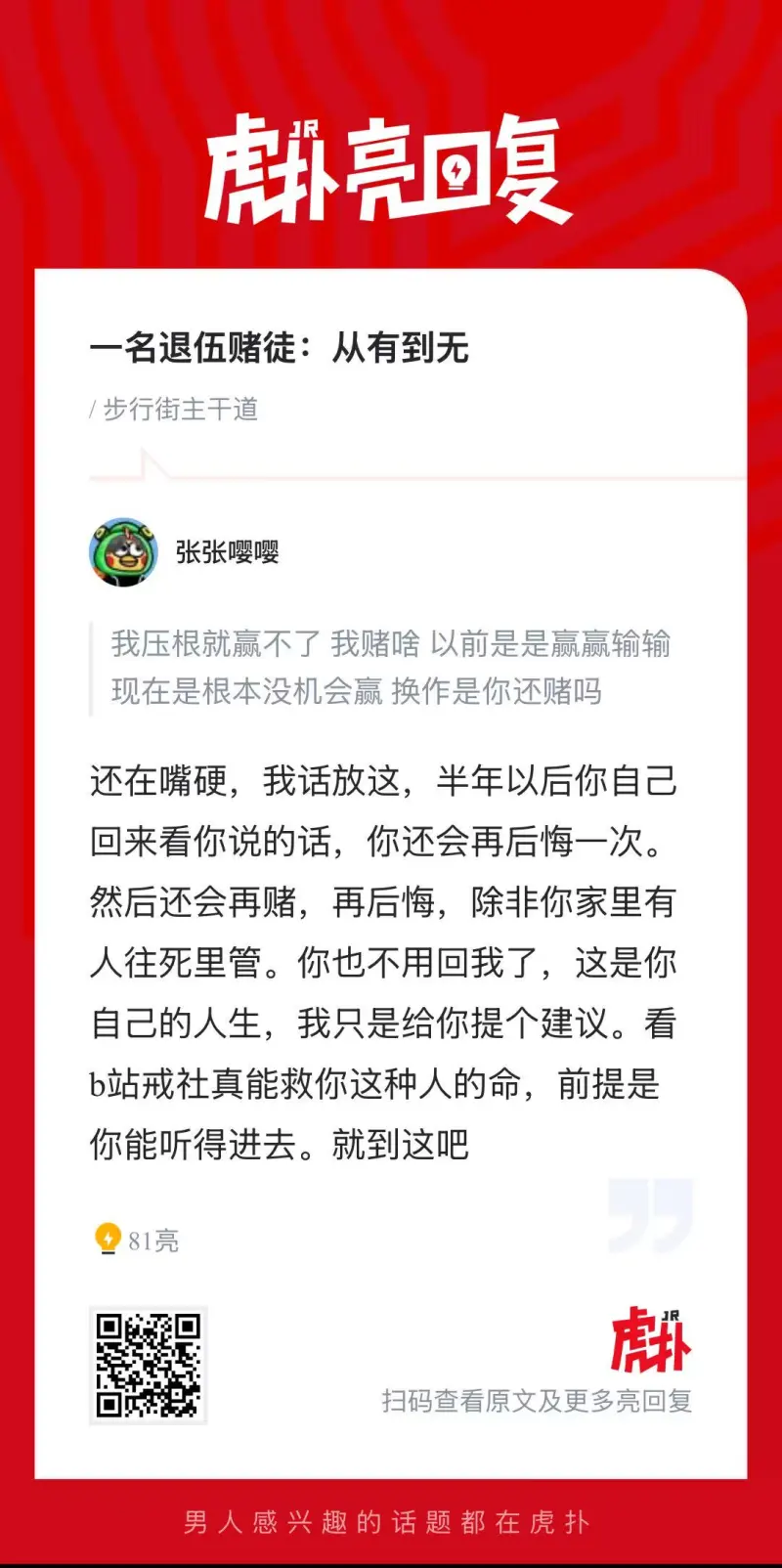 今天的热议来自一位赌徒JR的自述: